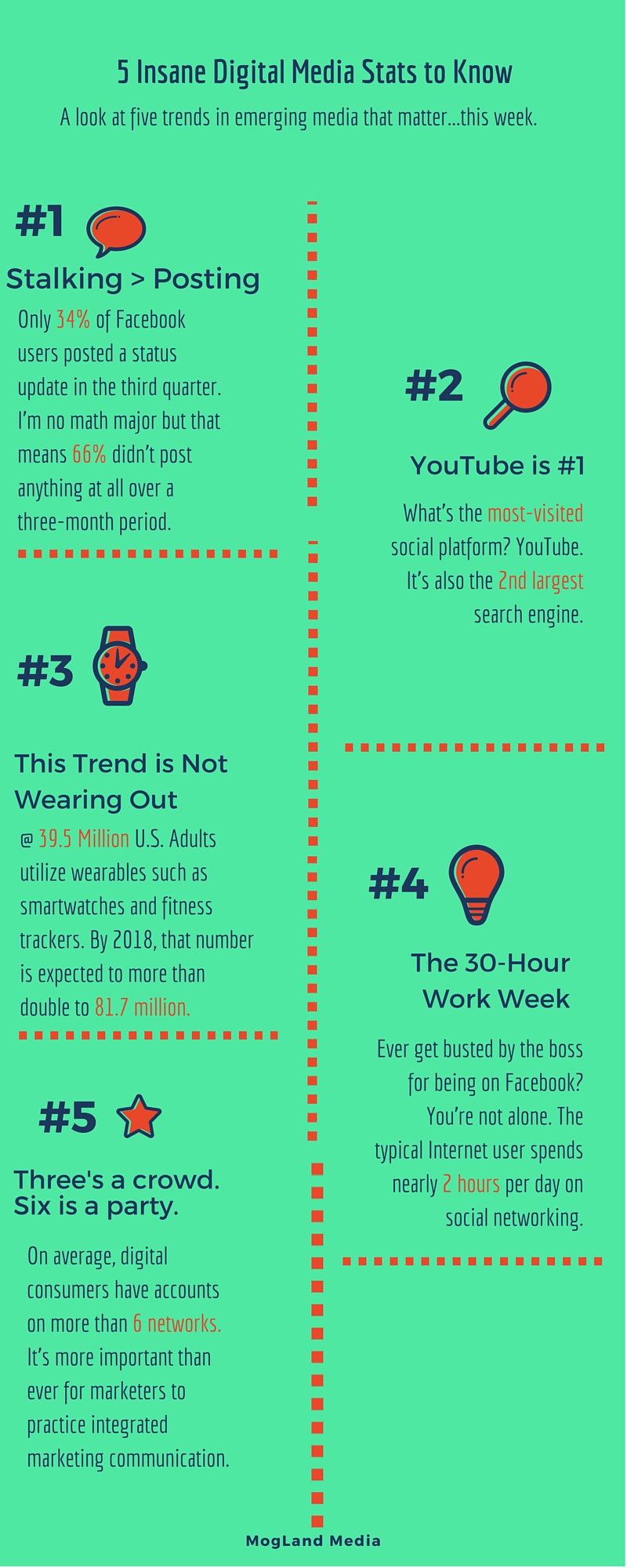Thanks to social media and the www it’s never been easier for marketers to reach an audience. Take a look at this infographic and dive in to five digital media trends that are shaping consumer behavior. Why check out this infographic? Because data like this is what makes now an incredible time to be a marketer.
